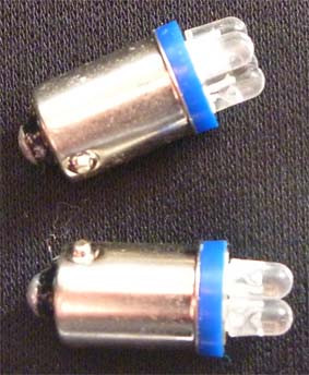 Blue LED BA9S Bayonet Base Globe with Four LED Diodes. 24 Volt Only. Pair.